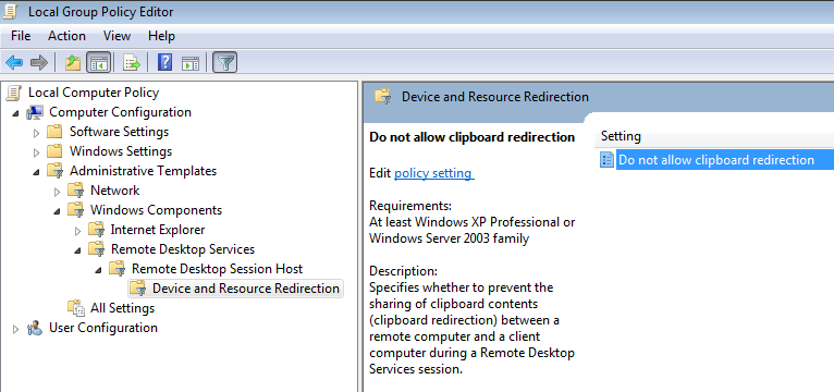 1. Computer Configuration\Administrative Templates\Windows Components\Remote Desktop Services\Remote Desktop Session Host\Device and Resource Redirection\Do not allow clipboard redirection.