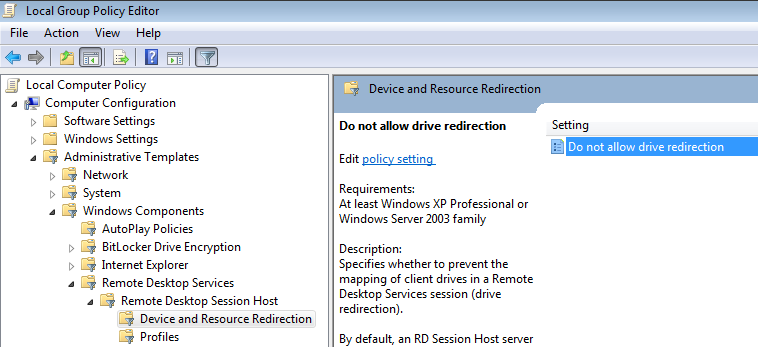 2. Computer Configuration\Administrative Templates\Windows Components\Remote Desktop Services\Remote Desktop Session Host\Device and Resource Redirection\Do not allow drive redirection.