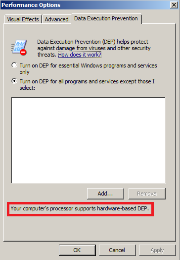 Data execution prevention reprezinta un set de tehnologii Hardware si Software pentru a proteja sistemul de exploatari malitioase de coduri. Incepand cu tehnologiile Server 2003 SP1 DEP este activat si hardware si software. Hardware DEP marcheaza locatiile de memorie dintr-un proces ca si non-executabile decat daca locatia respectiva contine un cod de executare specific. Exista atacuri ce incearca sa introduca si sa execute coduri din partea de memorie non-executabila dar DEP previne aceste atacuri, interceptandu-le si ridicand o eventuala exceptie.