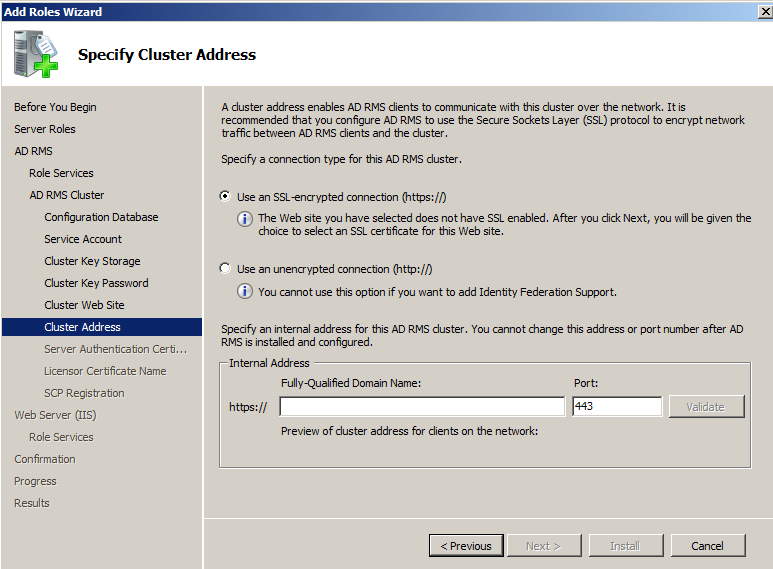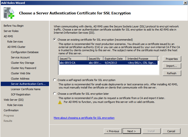 - Un cont de user obisnuit (un service account) pentru a asigura o identitate serviciului de RMS si pentru a comunica cu alte servicii. Nu este recomandata instalarea AD RMS pe un DC dar daca acest lucru este necesar atunci contul va trebui sa faca parte din grupul Domain Admins sau Enterprise Admins.