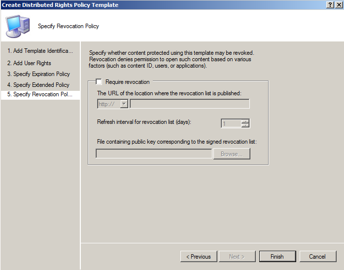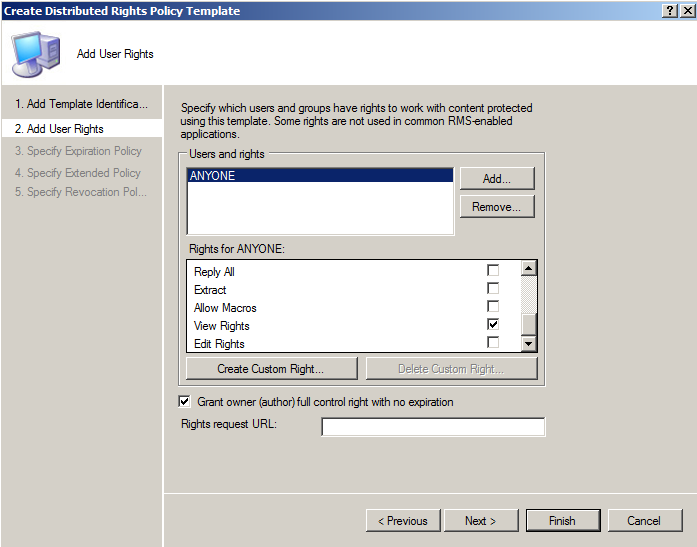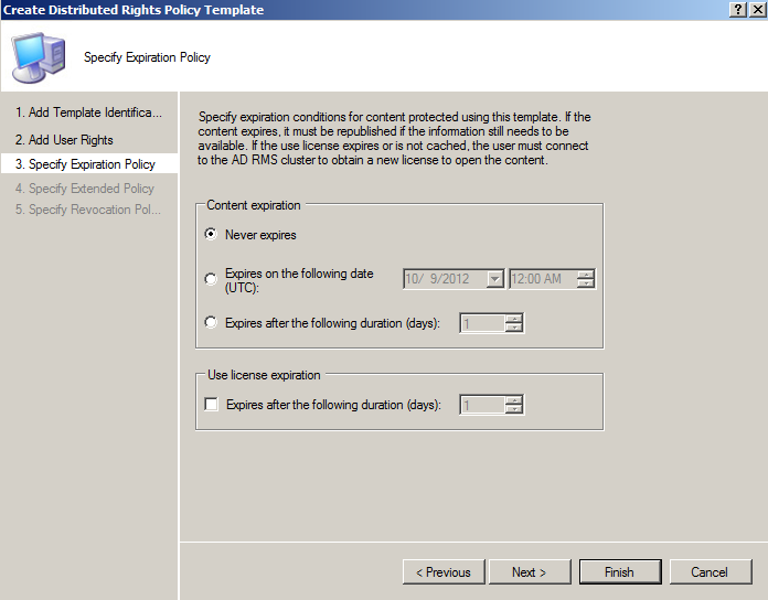 Acum puteti crea un policy template care va stabili ce reguli si conditii se vor aplica continutului pe care vreti sa il protejati. Aici se pot stabili grupuri carora sa li se aplice setarile si ce anume sa li se aplice. Mai jos am facut o configurare simpla dar puteti vedea din optiuni ca setarile sunt foarte flexibile, putandu-se stabili si un interval de timp dupa care sa expire.