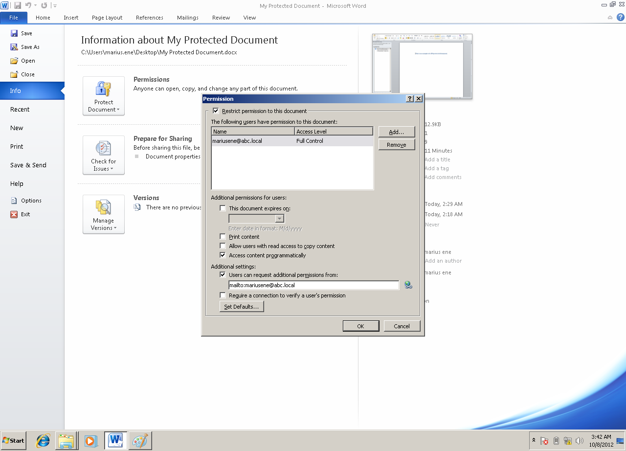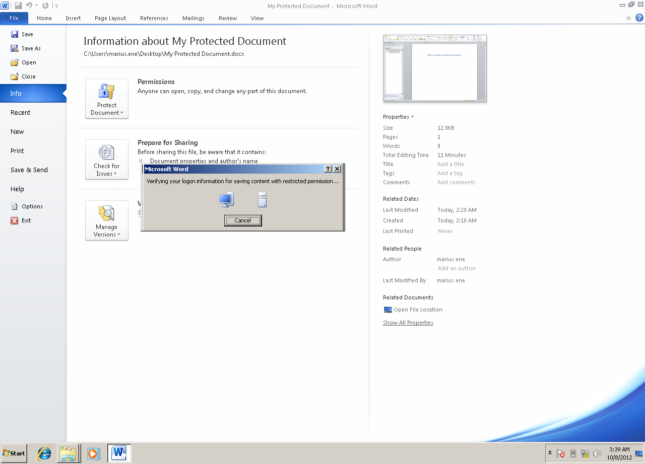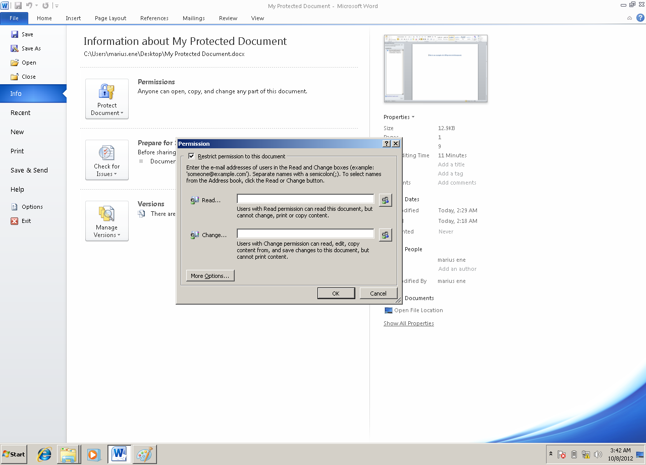 Fiind logat cu contul meu am creat un document Word pe care am ales sa il protejez si sa-I dau lui Gheorghe drept de citire fara drept de salvare, trimitere ca atasament sau modificare.