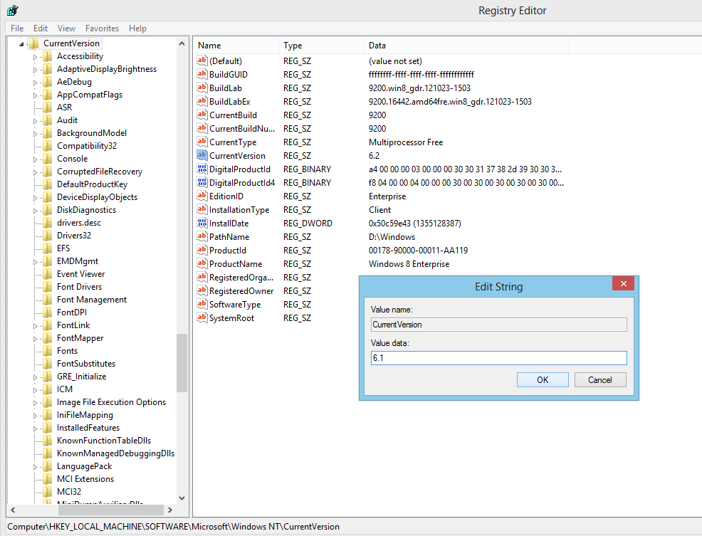 Stringul CurrentVersion va fi in mod normal 6.2. Acesta trebue modificat in 6.1