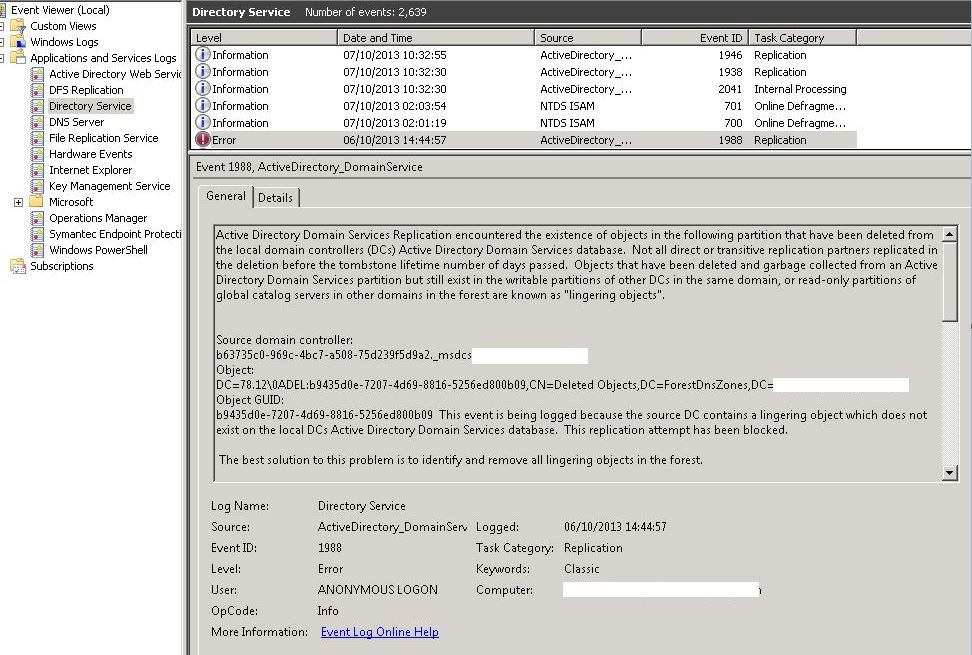 DC-ul destinatie va inregistra evenimentul cu ID 1988 in care se va afisa obiectul si DC-ul sursa care il contine.