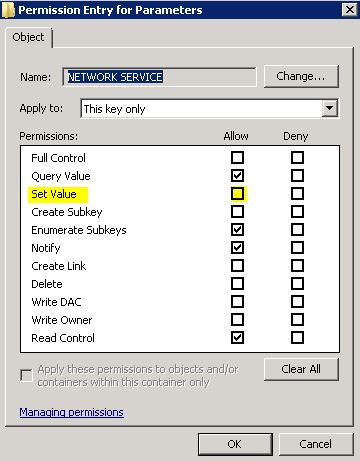 Apoi trebuie sa verificam permisiunile in registrii pentru serviciul respectiv.