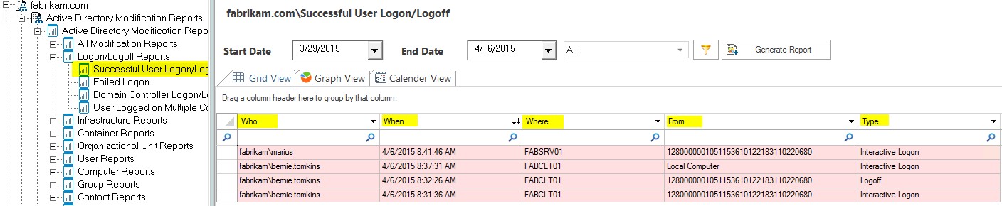 Once you have logon auditing enabled you can see for example when a User has logged on, from where and the type of logon that was performed. See below an example: