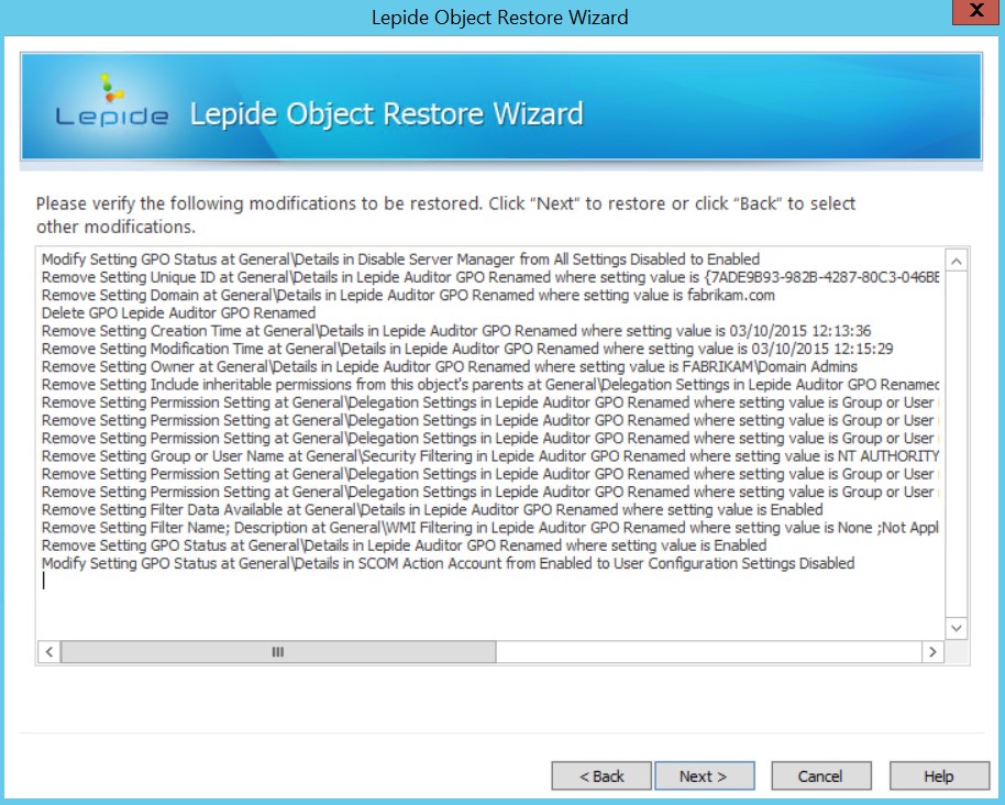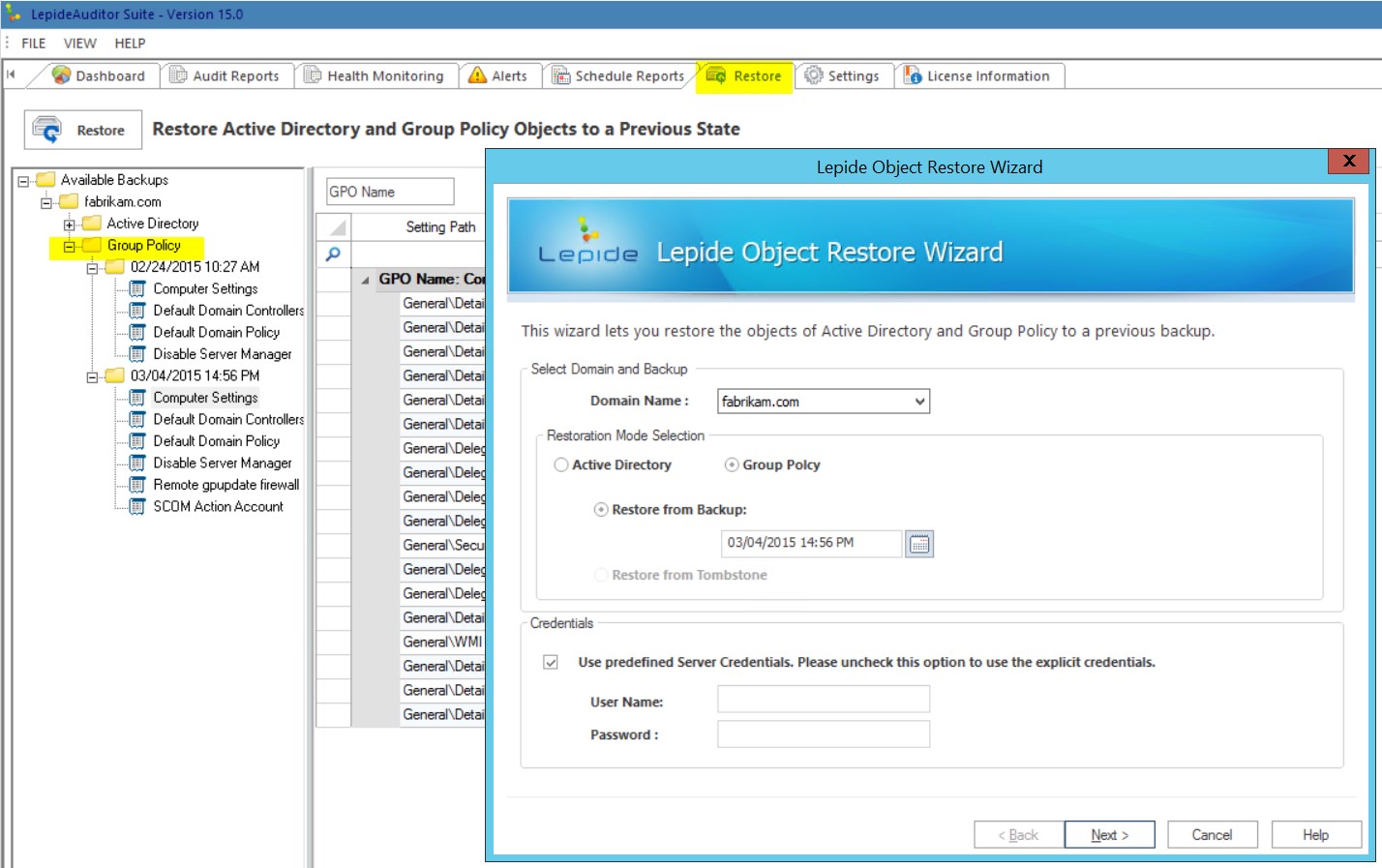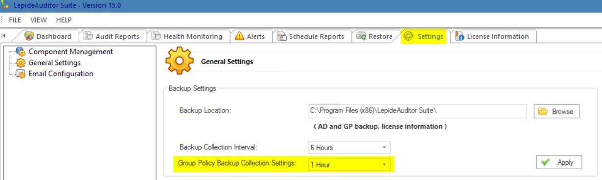 The Lepide GPO Auditor comes with the built in backup feature which can be extremely useful for restoring previous working GPOs to their initial state. By default the backup interval for GPOs is every 1 hour. If your environment doesn’t have a large number of GPOs or a lot of ‘hands’ working with them you can set this interval to something like every 8 hours.
