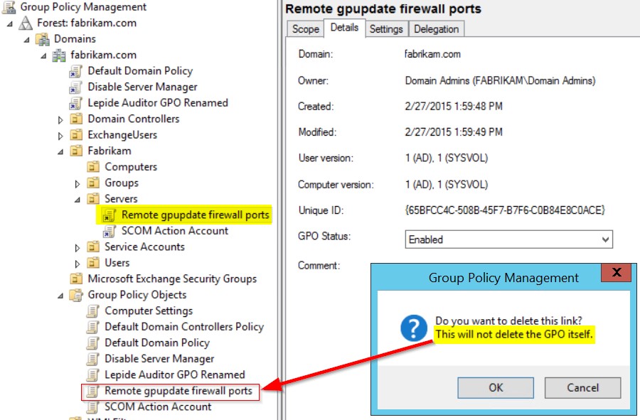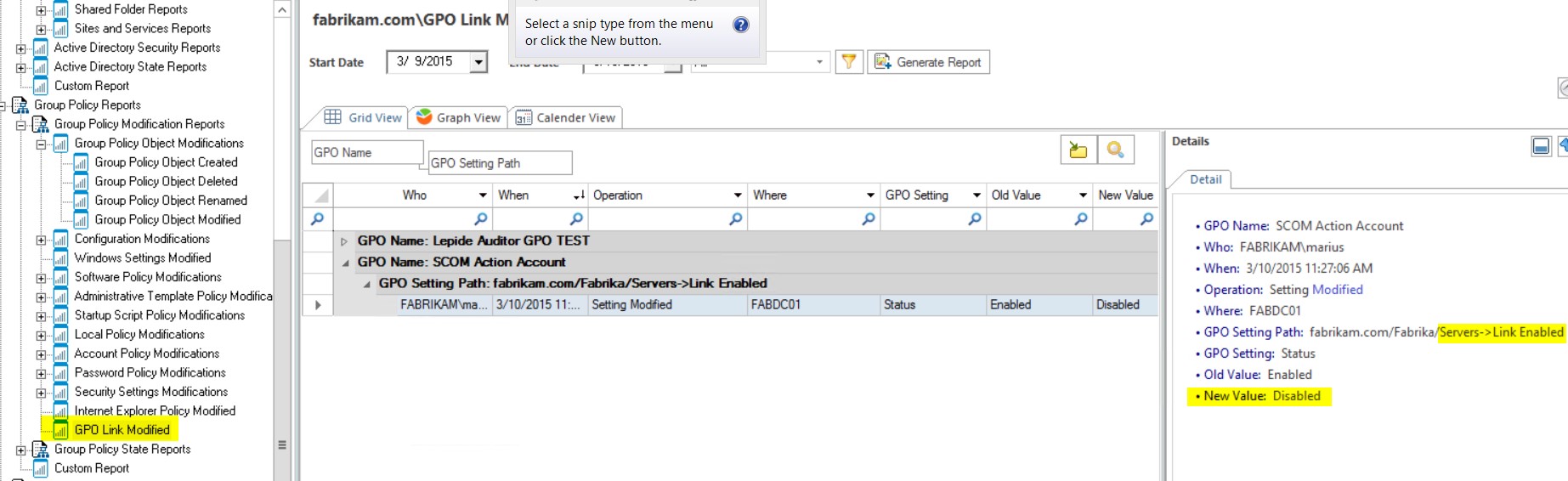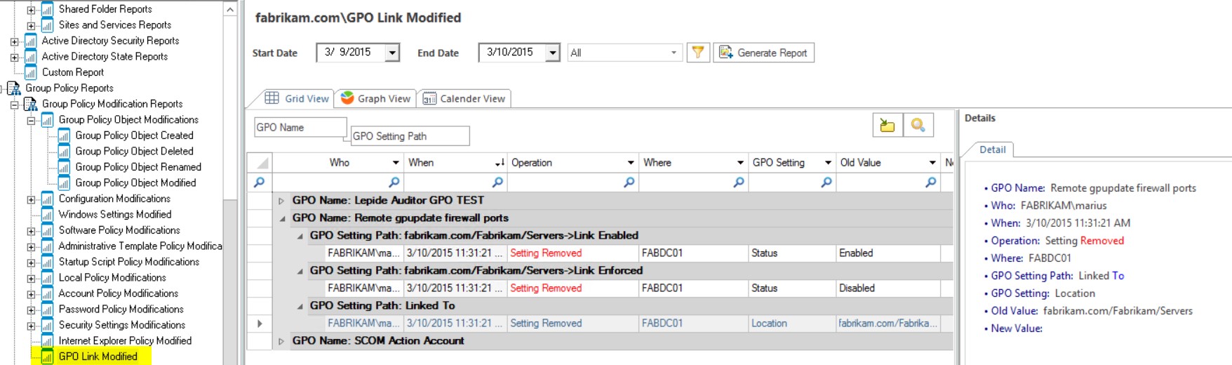 I did a lot of tests with the GPO monitoring part and I have to say that you cannot get any more detailed in terms of Auditing GPOs. I replicated a simple but common issue related to GPOs, when for example someone deletes a GPO link. By doing this, the GPO is not removed but the settings will no longer apply. If you use a complex OU structure and don’t link GPOs to the Domain Root and filter using groups, it can be hard to detect when this has happened.
