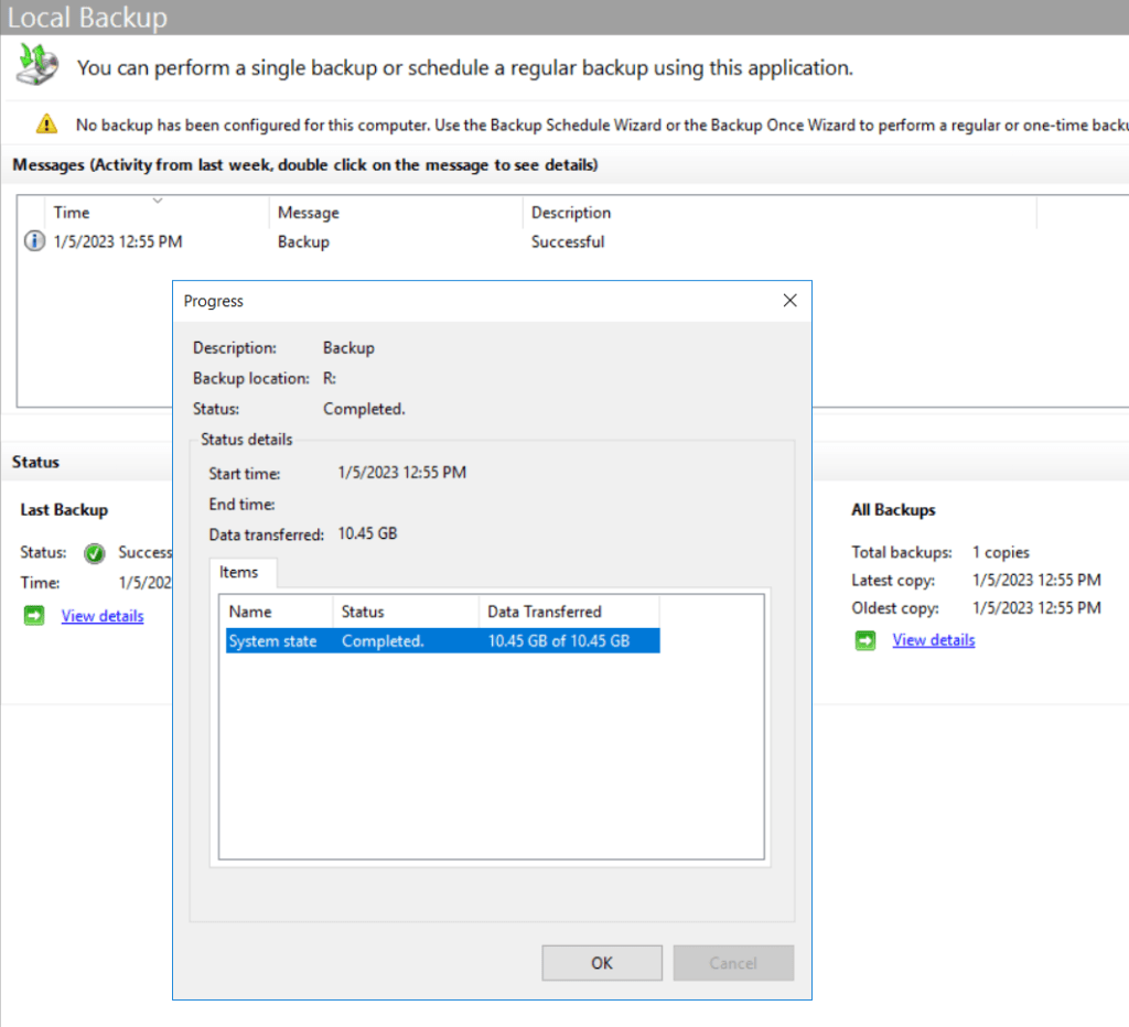 The backup of the system state for my lab environment took about 20 minutes to complete.