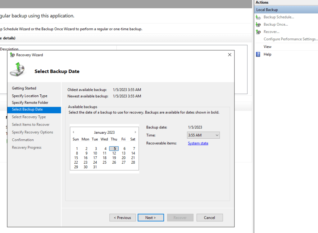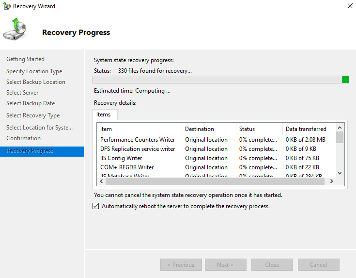 In this lab the destination server is a domain controller but doesn’t have to be as you will see at the end that the server where the backup is restored will be formatted. Ideally the destination server should be a new one.