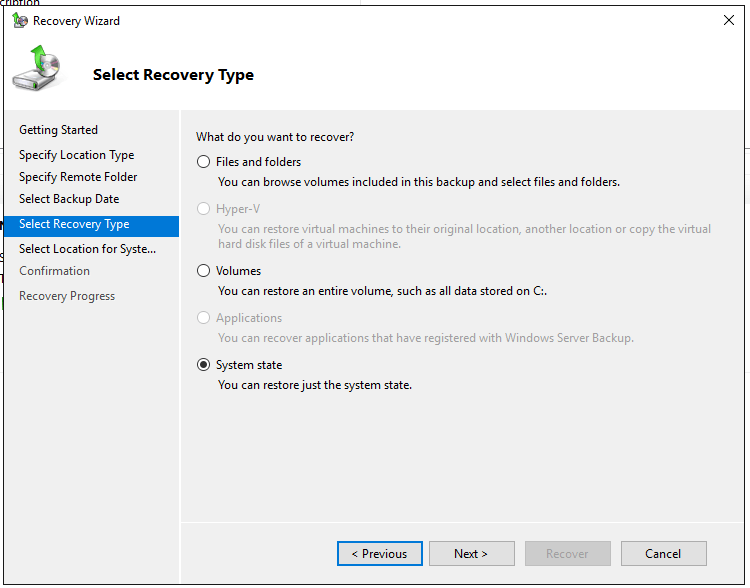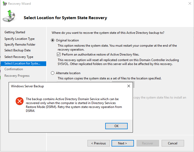 - If the target DC is running in a VM on Hyper-V and the backup is stored on a network location, you must install a legacy network adapter.