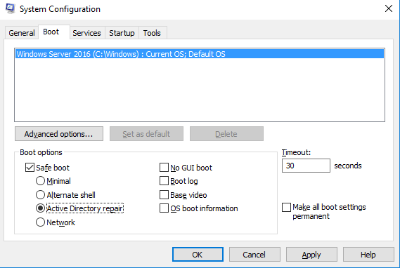 So we try now to do it from DSRM. Execute the command msconfig.exe and select the boot option to DSRM.