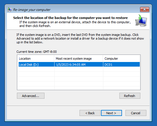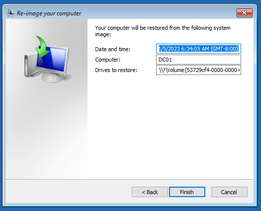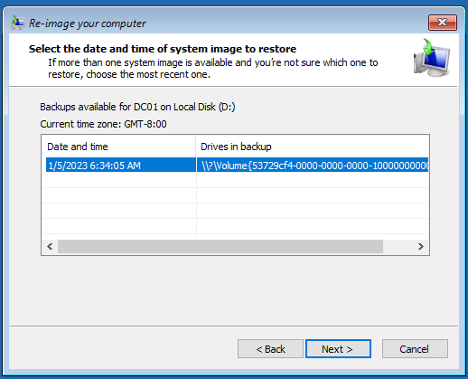 Case 2: Attempt to restore system state, C:, reserved from DC01 to DC02