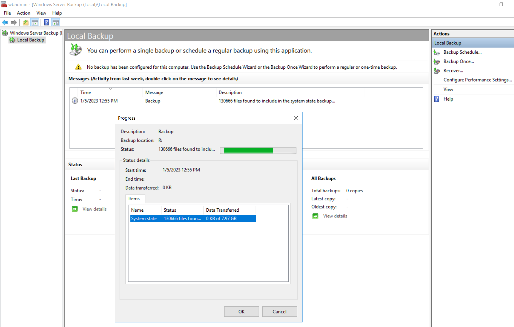 While in progress it will look like this in PowerShell or the Windows Backup console.