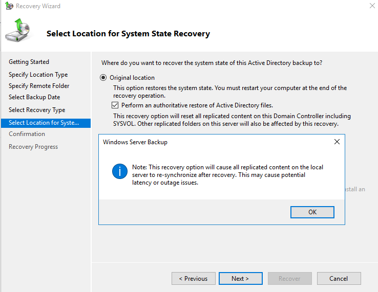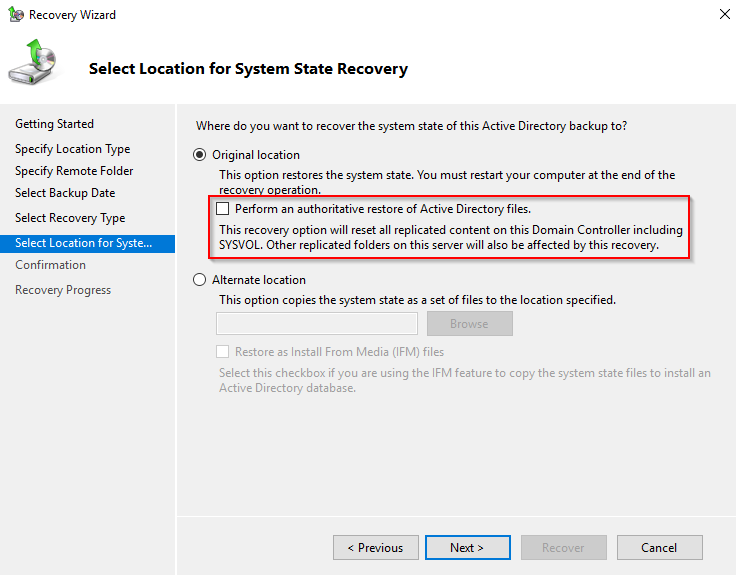 - After you perform a full server recovery, you need to separately perform an authoritative restore of SYSVOL, as described in AD Forest Recovery – Performing an authoritative synchronization of DFSR-replicated SYSVOL.