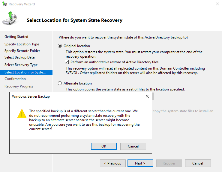 - If the target DC is running in a VM on Hyper-V and the backup is stored on a network location, you must install a legacy network adapter.