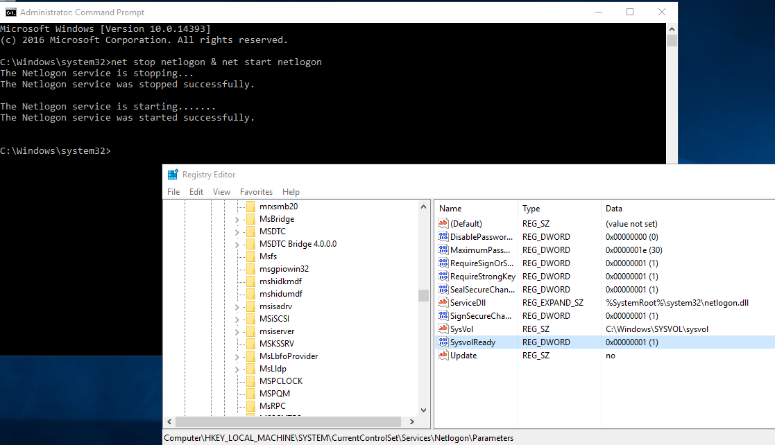 - Change the SysvolReady value from 0 to 1;