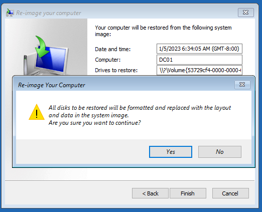 Case 2: Attempt to restore system state, C:, reserved from DC01 to DC02