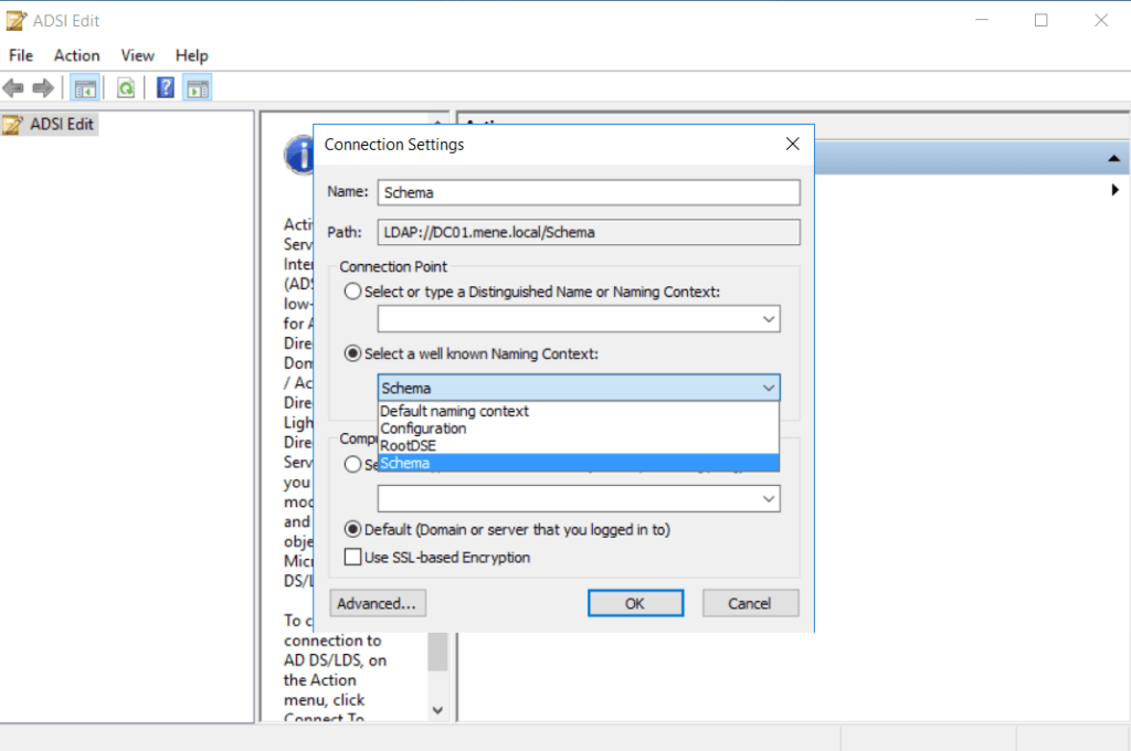 - Connect to the Schema naming context . In this case it would be CN=Schema,CN=Configuration,DC=mene,DC=local)