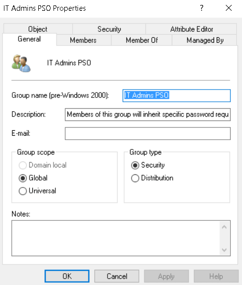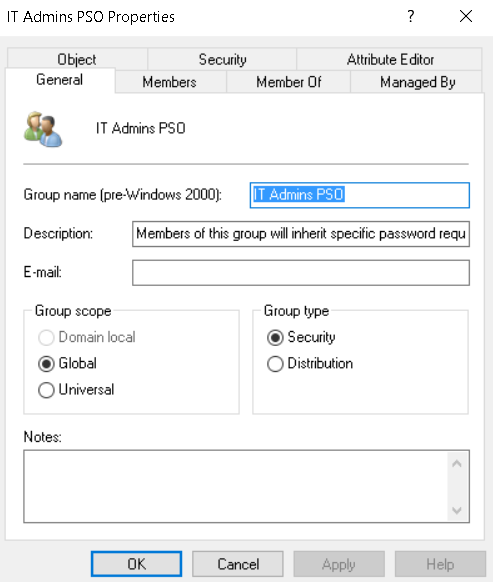 Notes: The new password settings object (PSO) can only be scoped to Global Security Groups. Membership in the Domain Admins group or equivalent permissions is required.