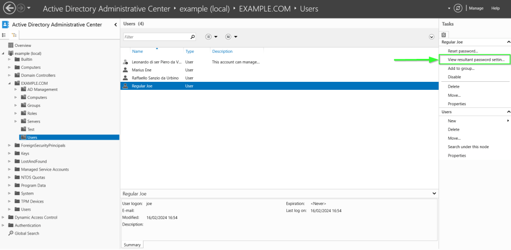 On the right site, in the Tasks panel, select View resultant password settings.