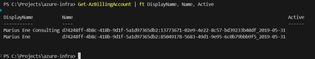Get-AzBillingAccount | ft DisplayName, Name, Active