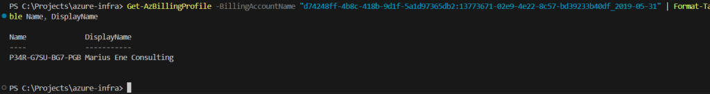 Get-AzBillingProfile -BillingAccountName "d74248ff-4b8c-418b-9d1f-5a1d97365db2:13773671-02e9-4e22-8c57-bd39233b40df_2019-05-31" | Format-Table Name, DisplayName