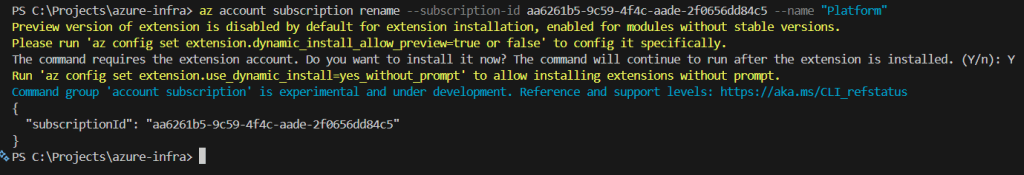 Rename-AzSubscription -SubscriptionId "aa6261b5-9c59-4f4c-aade-2f0656dd84c5" -SubscriptionName "Platform"