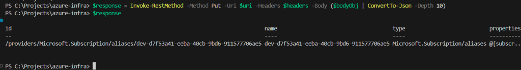 $tok = Get-AzAccessToken -ResourceUrl "https://management.core.windows.net/" # Convert SecureString -> plain string $token = [Runtime.InteropServices.Marshal]::PtrToStringAuto( [Runtime.InteropServices.Marshal]::SecureStringToBSTR($tok.Token) ) $tok.ExpiresOn $tok.TenantId $token.Substring(0,20)$billingAccountName = "d74248ff-..." $billingProfileName = "P34R-..." $invoiceSectionName = "EHPI-..." $scope = "/providers/Microsoft.Billing/billingAccounts/$billingAccountName/billingProfiles/$billingProfileName/invoiceSections/$invoiceSectionName" $alias = "dev-" + ([guid]::NewGuid().ToString()) $uri = "https://management.azure.com/providers/Microsoft.Subscription/aliases/$alias/?api-version=2021-10-01" $uri $bodyObj = @{ properties = @{ displayName = "Dev" workload = "DevTest" billingScope = $scope } } $headers = @{ Authorization = "Bearer $token" "Content-Type" = "application/json" } $response = Invoke-RestMethod -Method Put -Uri $uri -Headers $headers -Body ($bodyObj | ConvertTo-Json -Depth 10) $response