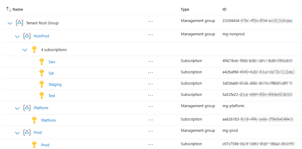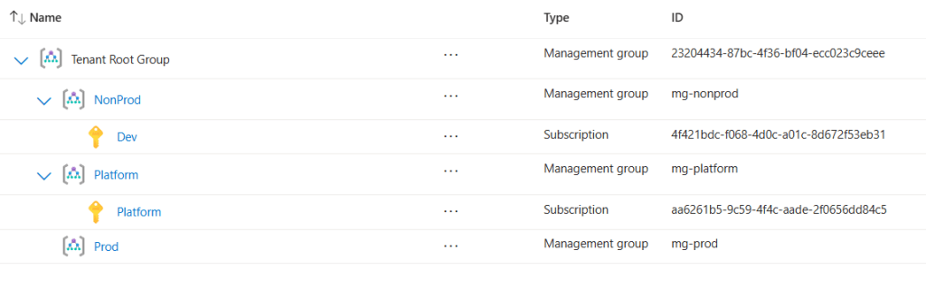New-AzManagementGroup -GroupId "mg-platform" -DisplayName "Platform" New-AzManagementGroup -GroupId "mg-prod" -DisplayName "Prod" New-AzManagementGroup -GroupId "mg-nonprod" -DisplayName "NonProd"