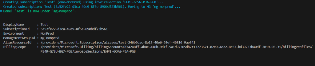 $billingAccountName = "d74248ff-4b8c-418b-9d1f-5a1d97365db2:13773671-02e9-4e22-8c57-bd39233b40df_2019-05-31" $billingProfileName = "P34R-G7SU-BG7-PGB" $invoiceSectionName = "EHPI-6CVW-PJA-PGB" $billingScope = "/providers/Microsoft.Billing/billingAccounts/$billingAccountName/billingProfiles/$billingProfileName/invoiceSections/$invoiceSectionName" New-AzSubscription -DisplayName "Dev" -BillingScope $billingScope