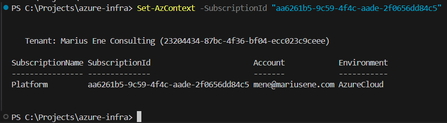 Set-AzContext -SubscriptionId "aa6261b5-9c59-4f4c-aade-2f0656dd84c5"