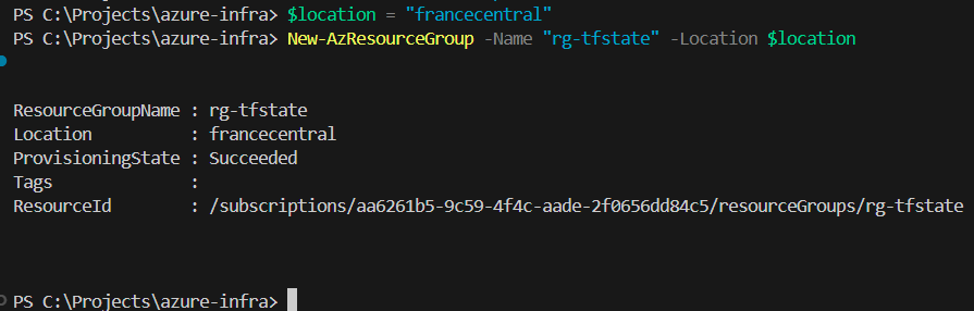 $location = "francecentral" New-AzResourceGroup -Name "rg-tfstate" -Location $location