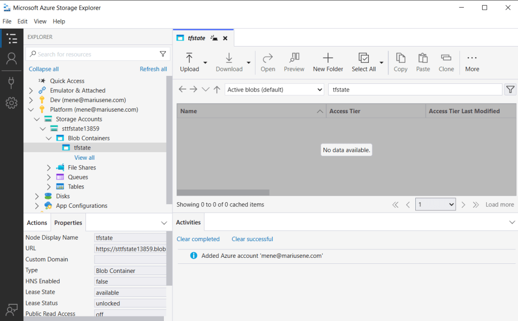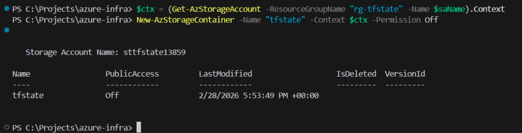 $ctx = (Get-AzStorageAccount -ResourceGroupName "rg-tfstate" -Name $saName).Context New-AzStorageContainer -Name "tfstate" -Context $ctx -Permission Off