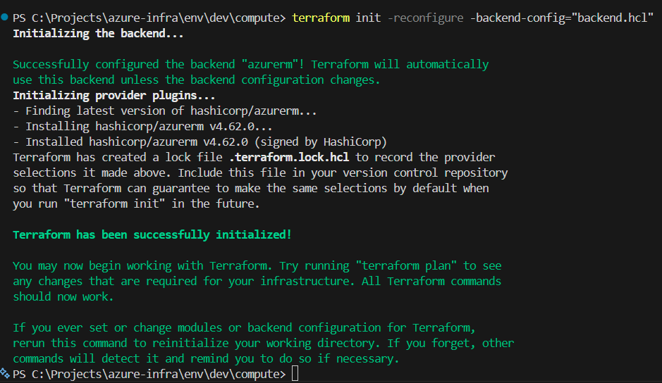 terraform init -reconfigure -backend-config="backend.hcl"