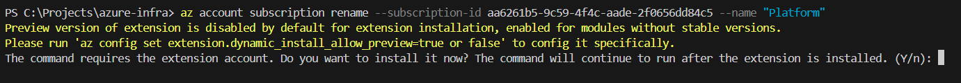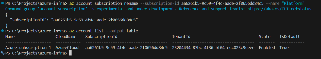Rename-AzSubscription -SubscriptionId "aa6261b5-9c59-4f4c-aade-2f0656dd84c5" -SubscriptionName "Platform"