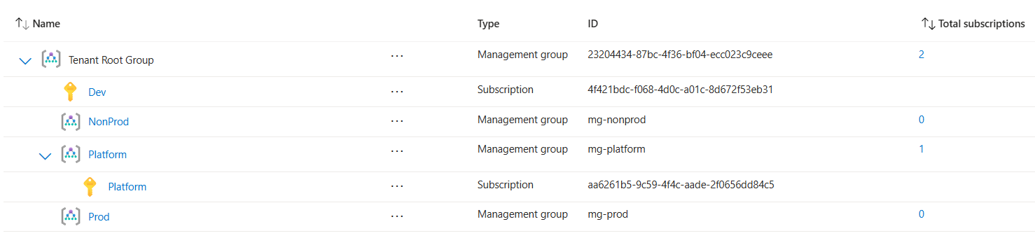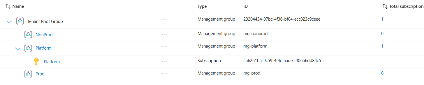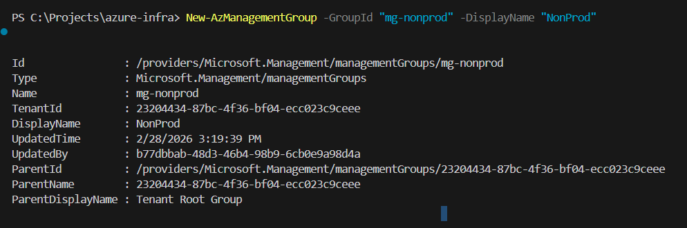 New-AzManagementGroup -GroupId "mg-platform" -DisplayName "Platform" New-AzManagementGroup -GroupId "mg-prod" -DisplayName "Prod" New-AzManagementGroup -GroupId "mg-nonprod" -DisplayName "NonProd"