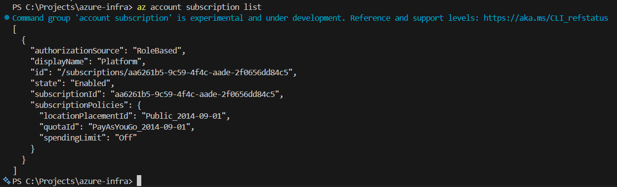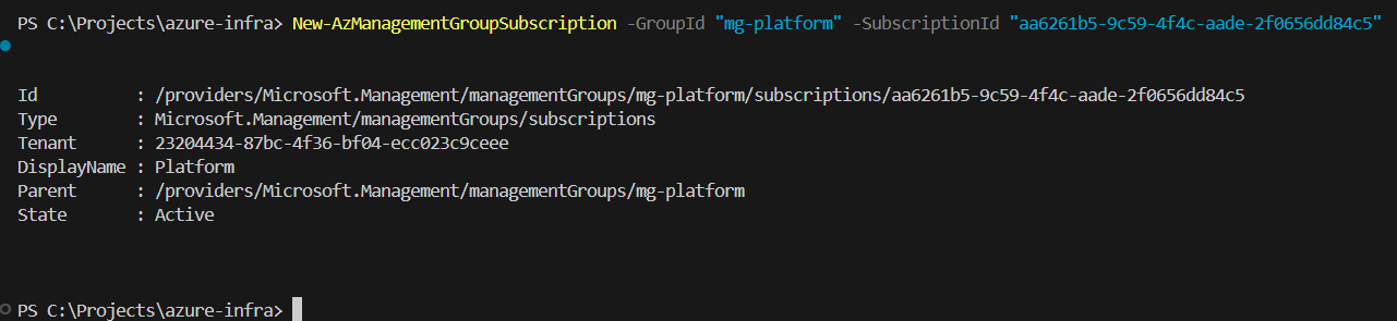 New-AzManagementGroupSubscription -GroupId "mg-platform" -SubscriptionId "aa6261b5-9c59-4f4c-aade-2f0656dd84c5"