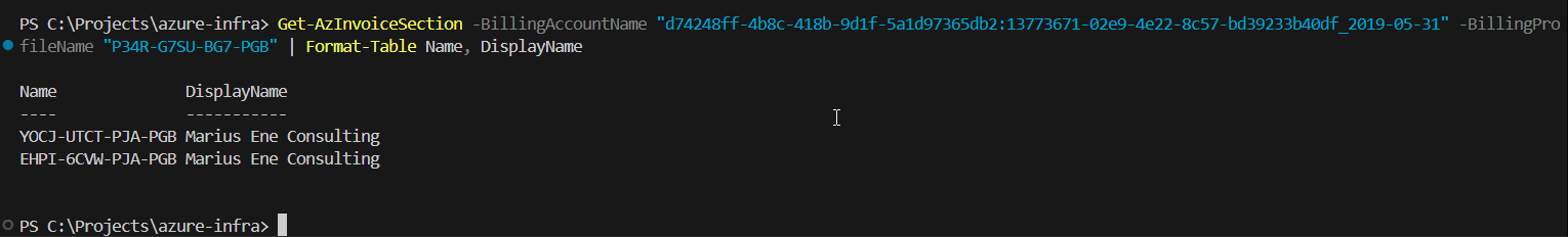 Get-AzInvoiceSection -BillingAccountName "d74248ff-4b8c-418b-9d1f-5a1d97365db2:13773671-02e9-4e22-8c57-bd39233b40df_2019-05-31" -BillingProfileName "P34R-G7SU-BG7-PGB" | Format-Table Name, DisplayName