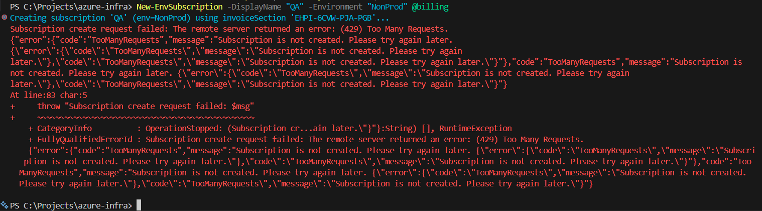 $tok = Get-AzAccessToken -ResourceUrl "https://management.core.windows.net/" # Convert SecureString -> plain string $token = [Runtime.InteropServices.Marshal]::PtrToStringAuto( [Runtime.InteropServices.Marshal]::SecureStringToBSTR($tok.Token) ) $tok.ExpiresOn $tok.TenantId $token.Substring(0,20)$billingAccountName = "d74248ff-..." $billingProfileName = "P34R-..." $invoiceSectionName = "EHPI-..." $scope = "/providers/Microsoft.Billing/billingAccounts/$billingAccountName/billingProfiles/$billingProfileName/invoiceSections/$invoiceSectionName" $alias = "dev-" + ([guid]::NewGuid().ToString()) $uri = "https://management.azure.com/providers/Microsoft.Subscription/aliases/$alias/?api-version=2021-10-01" $uri $bodyObj = @{ properties = @{ displayName = "Dev" workload = "DevTest" billingScope = $scope } } $headers = @{ Authorization = "Bearer $token" "Content-Type" = "application/json" } $response = Invoke-RestMethod -Method Put -Uri $uri -Headers $headers -Body ($bodyObj | ConvertTo-Json -Depth 10) $response