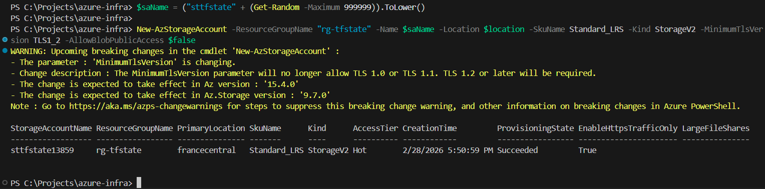 $saName = ("sttfstate" + (Get-Random -Maximum 999999)).ToLower() New-AzStorageAccount -ResourceGroupName "rg-tfstate" -Name $saName -Location $location -SkuName Standard_LRS -Kind StorageV2 -MinimumTlsVersion TLS1_2 -AllowBlobPublicAccess $false