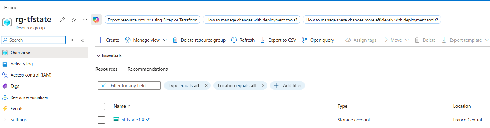 $location = "francecentral" New-AzResourceGroup -Name "rg-tfstate" -Location $location