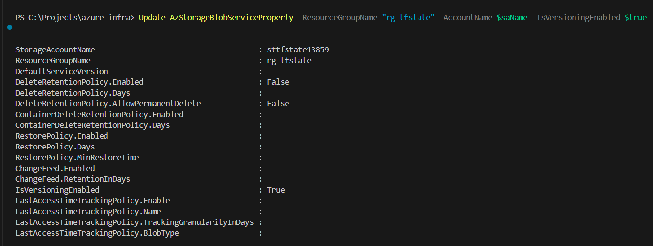 Update-AzStorageBlobServiceProperty -ResourceGroupName "rg-tfstate" -AccountName $saName -IsVersioningEnabled $true
