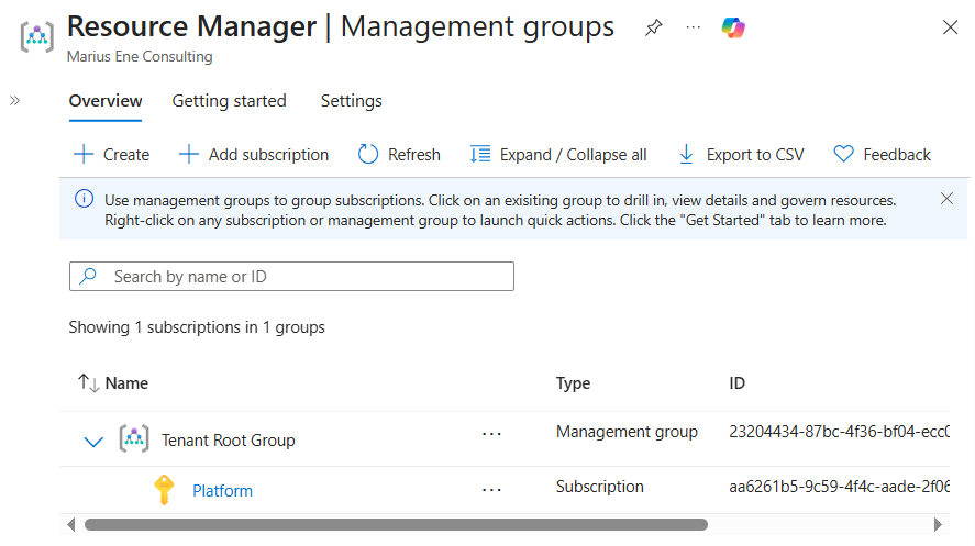 Now we move the ‘Platform’ subscription under the Platform management group.